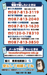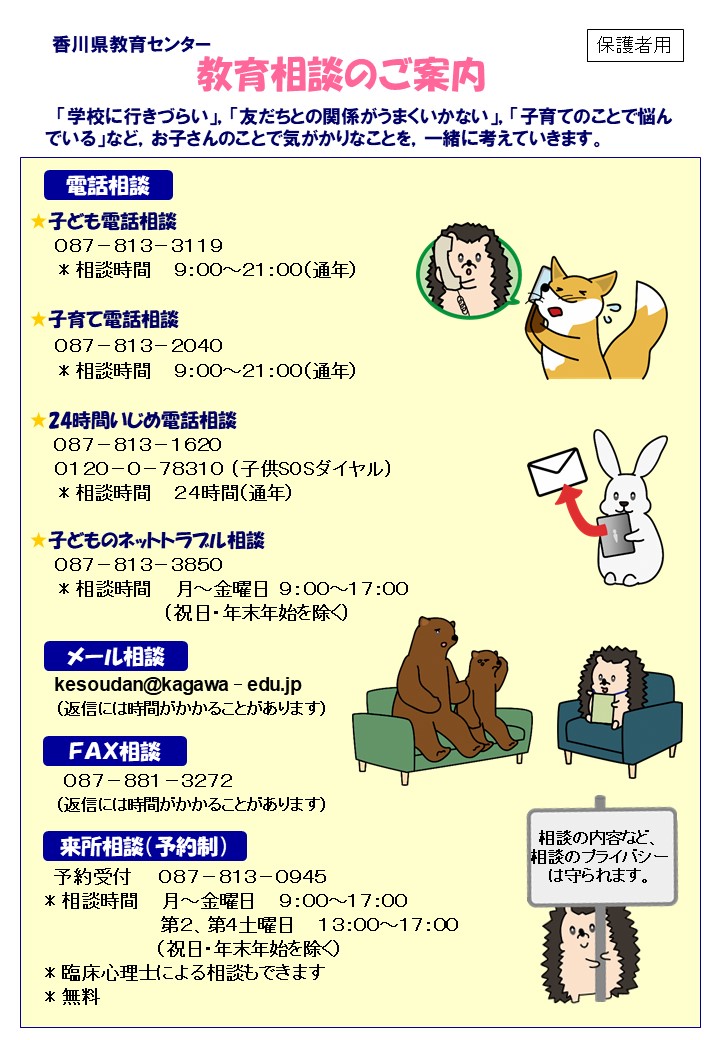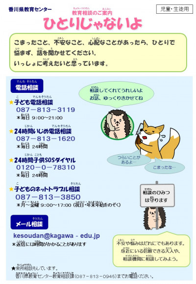 香川県教育センターの相談窓口を広く周知するため、県内の保育所、幼稚園、認定こども園、小学校、中学校、高等学校、特別支援学校の児童生徒及び保護者等に配布しています。