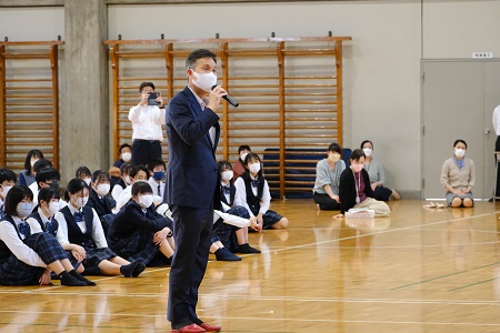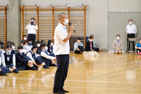 7月1日(金) 表彰式・壮行式 先日行われた県総体で奮闘した選手たちの功績を称える表彰式が行われました。その後、全国 大会出場者と県大会に出場する野球部と吹奏楽部の壮行式が行われました。 吹奏楽部が奏でる入場曲に合わせ堂々と入場し、選手たちは力強く、大会に臨む抱負を述べました。また、校長先生と生徒会長からの激励の言葉や、応援部による全校生の思いを乗せたエール を受け、奮闘の決意をさらに固くしました。各大会で全力を発揮し、活躍してくれることを期待しています。