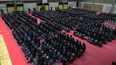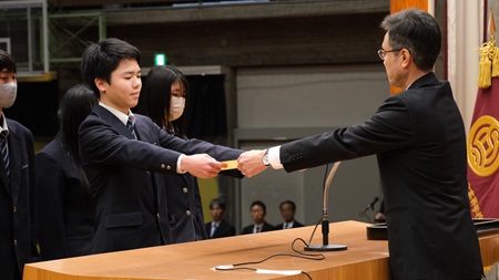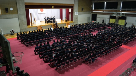 2月29日(木)同窓会入会式と表彰式が行われました。同窓会入会式では、卒業する210名が入会し、3名の来賓から激励のお言葉をいただきました。また、同窓会長から高校生活での活躍が顕著だった生徒に同窓会長賞の授与が行われました。表彰式では、4年ぶりに全校生が体育館に入り行われました。