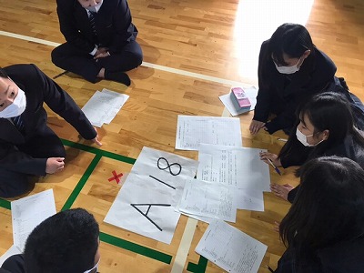 はじめは、緊張感がありましたが、アイスブレイクが終わるころには、打ち解けて話し合いが弾みました。各班の代表が意見をまとめて発表しました。なぜか発表者は、全員男子生徒でした。各家庭での両親の子育ての役割を比較し、様々な感想や意見が出ました。将来の自分を考える良い機会になったと思います。