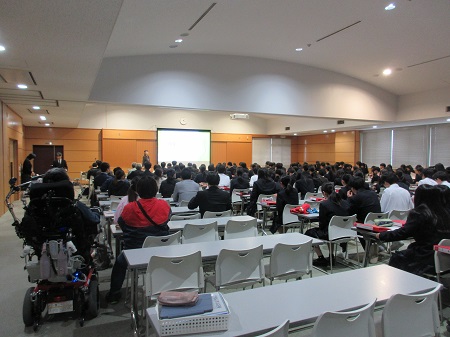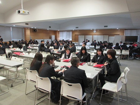 本日⑤⑥時間目、総合学科1年生「産業社会と人間」の授業において、中小企業家同友会のご協力のもと、地元企業22名の皆様にご参加いただき「インタビューシップ説明会」を行いました。⑤時間目は、「インタビューシップ」の意義・目的等の説明と中小企業家同友会方によるご講演をいただきました。⑥時間目は、グループに分かれ、そこに企業の皆様にご参加いただき、「働くことの意味」「仕事のやりがい」「なぜ、この仕事を始めたか」などについて質問し、お話を伺いました。1年生はみな、真剣に話に聞き入っていました。ご協力いただきました皆様、ありがとうございました。