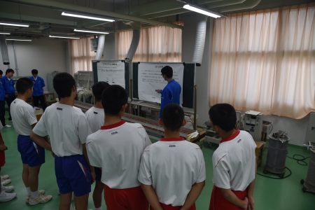 昨日の総合学科の一日体験入学に引き続き、本日は、工業科の一日体験を開催しました。141名の参加がありました。全体説明会の後、工業実習棟にて機械科、電気科、電子科の3つの科を全て見学しました。例えば、ガス溶接や旋盤を用いた実習、配線の組み立て、リニアモータカーのモデル走行実演など工業科の3年生が説明し、中学生が体験する場があり、それぞれの科の内容が理解できたと思います。