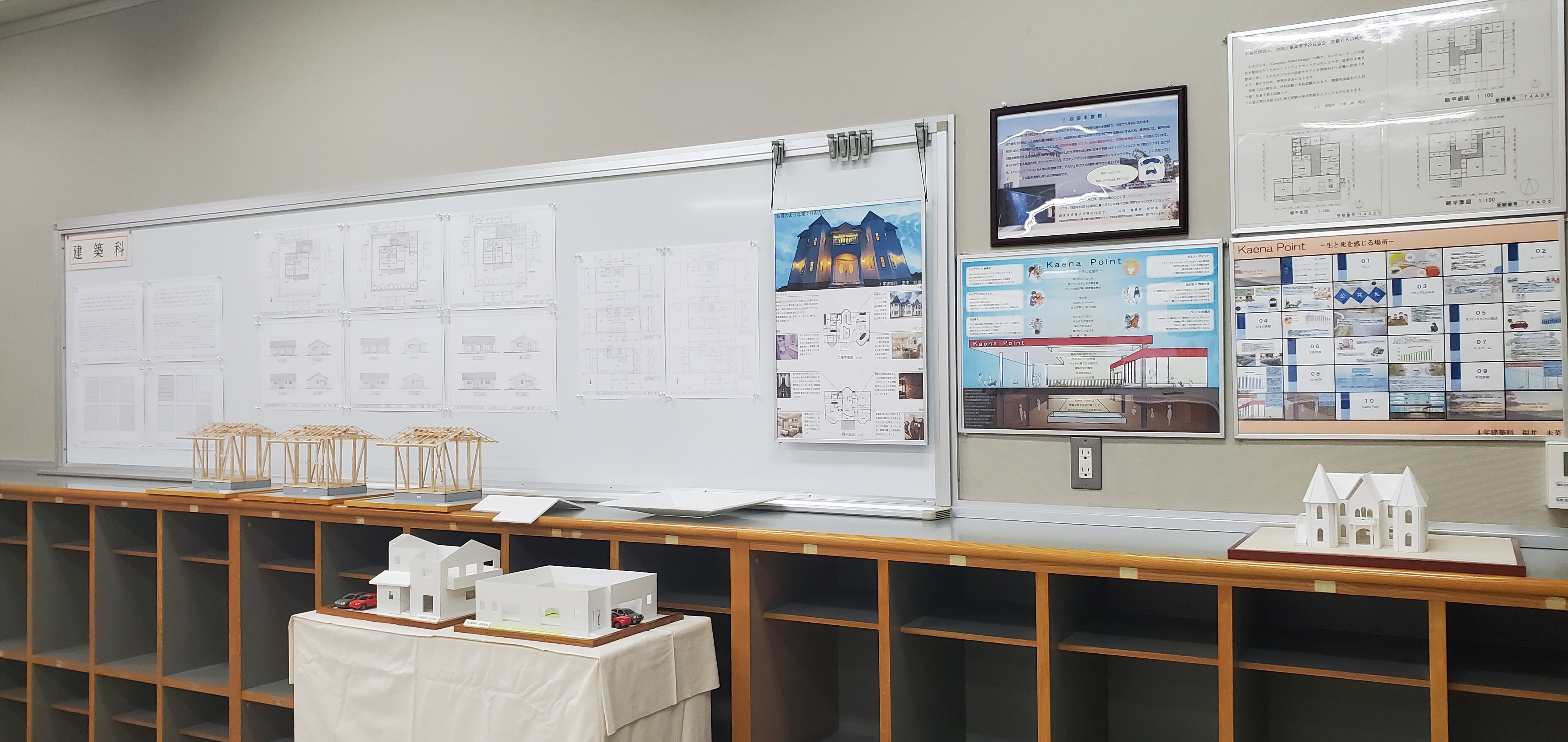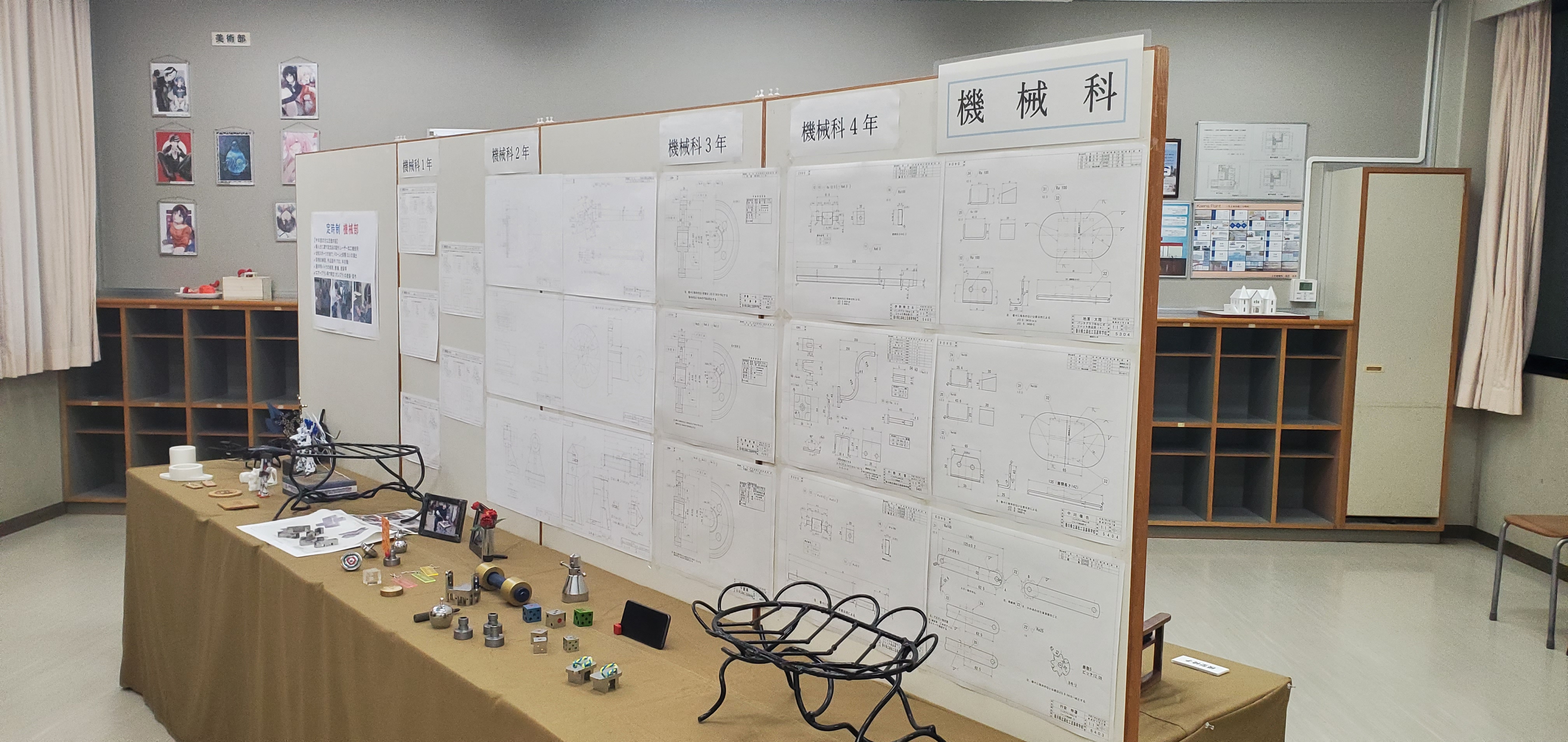 「定時制展示コーナー」では、授業で制作した作品や「定時制新聞」の掲示によってインテリア科、機械科、建築科の3学科や、生徒たちの普段の学校生活の紹介を行いました。また、美術部と機械部の作品展示も行いました。