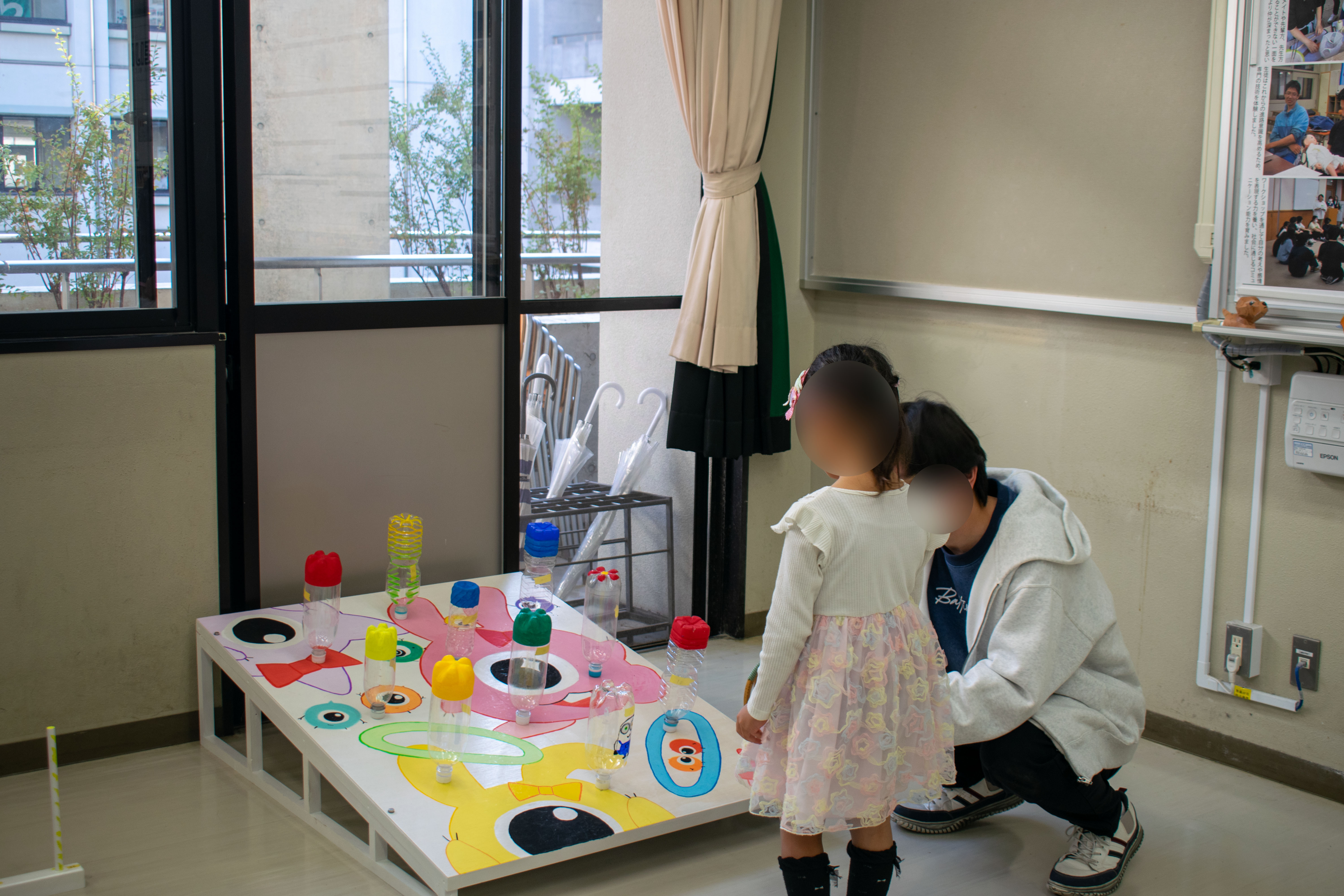「輪投げ&パターゴルフゲーム」では自分たちで作った遊具で、来場者の皆さんにゲームをしてもらいました。すべてクリアできた人には、生徒が制作したクジラ型とゾウ型のスマホスタンドををプレゼントしました。