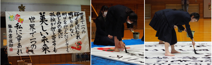 書道部は来年の干支「寅」にちなんだパフォーマンスをしました。一人ずつ順に干支の文字を書いて組み合わせ、力を合わせてトラの形を完成させました。志賀校長先生、山田教頭先生、石川先生、大前先生も参加しました。