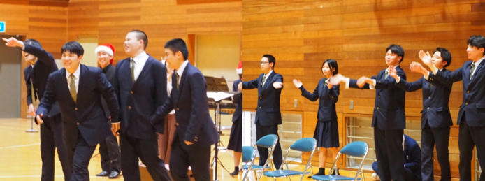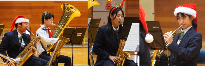 吹奏楽部は「クリスマスソングメドレー」、「アイドル」、「シング・シング・シング」など8曲を演奏し、会場は手拍子で盛り上がりました。