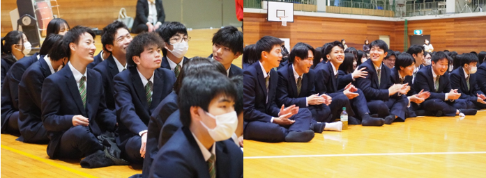 サンタとトナカイの衣装に身を包んだクリスマス仕様のチアリーダーたちが「ANTIFRAGILE」など7曲を踊り、会場を盛り上げました。山尾先生、高橋先生、大河先生、大山先生、福家先生もダンスに参加し、生徒からは歓声が上がりました。