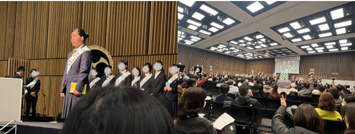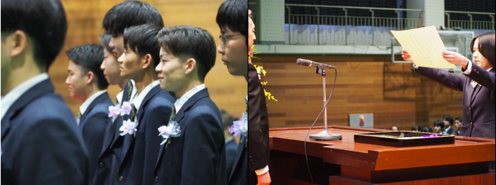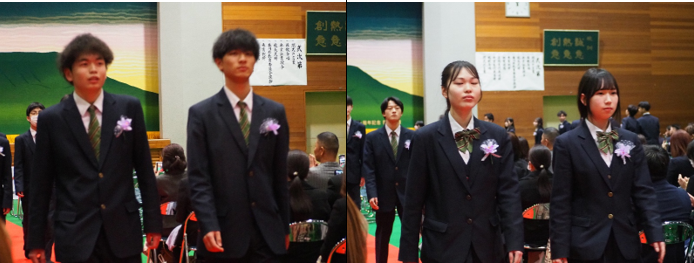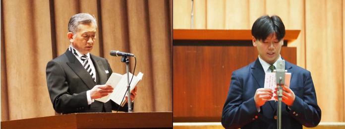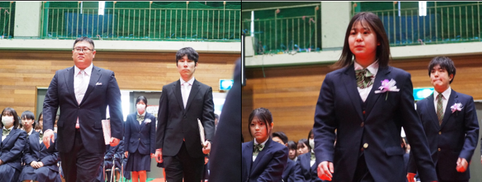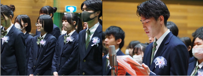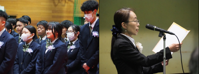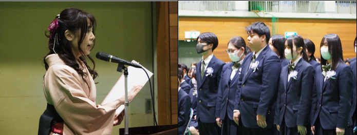 校長先生の式辞の後、在校生代表の新池さんが先輩への感謝を述べ、卒業生代表の金場さんが3年間の思い出や周りの方々への感謝を伝えました。