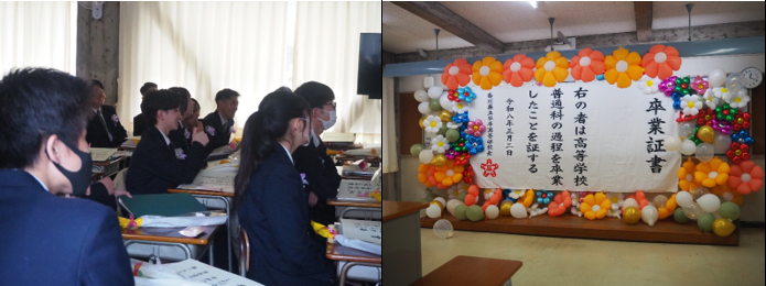 体育館を後にした卒業生は、各教室に戻り担任から一人ひとり卒業証書を受け取りました。クラスの思い出を振り返るムービーが流され、教室は感動と笑いにあふれ、最後のHRの時間を過ごしました。
