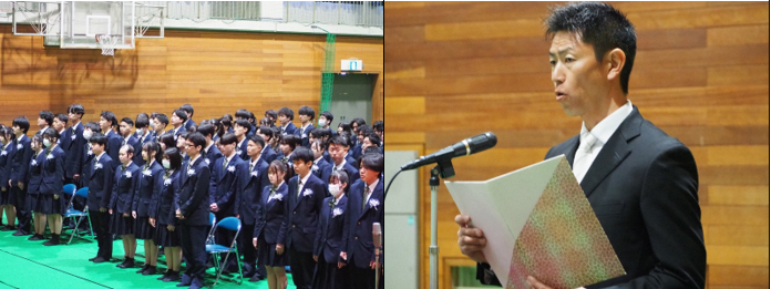 生徒会長の西岡さんの歓迎の言葉と、新入生代表の河野さんの挨拶が行われ、2・3年生から歓迎の拍手が送られました。