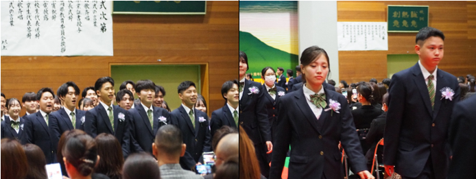 退場の際には、吹奏楽部の伴奏に合わせ、在校生有志が合唱をして卒業生を見送りました。体育館に温かく美しい歌声が広がり、感動的な演出となりました。また、サプライズで卒業生からメッセージが送られ、「琴高でよかった」「ありがとう」という言葉と共に体育館を後にしました。
