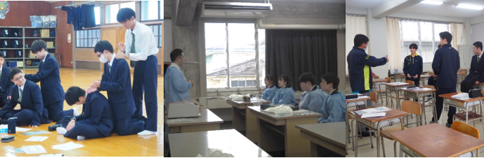 2019年1月23日(水)に1年生対象のAED講習会が行われました。日本赤十字より講師の方にお越しいただき、人形を使って心肺蘇生法の練習を行い、AEDの使い方を学ぶことができました。