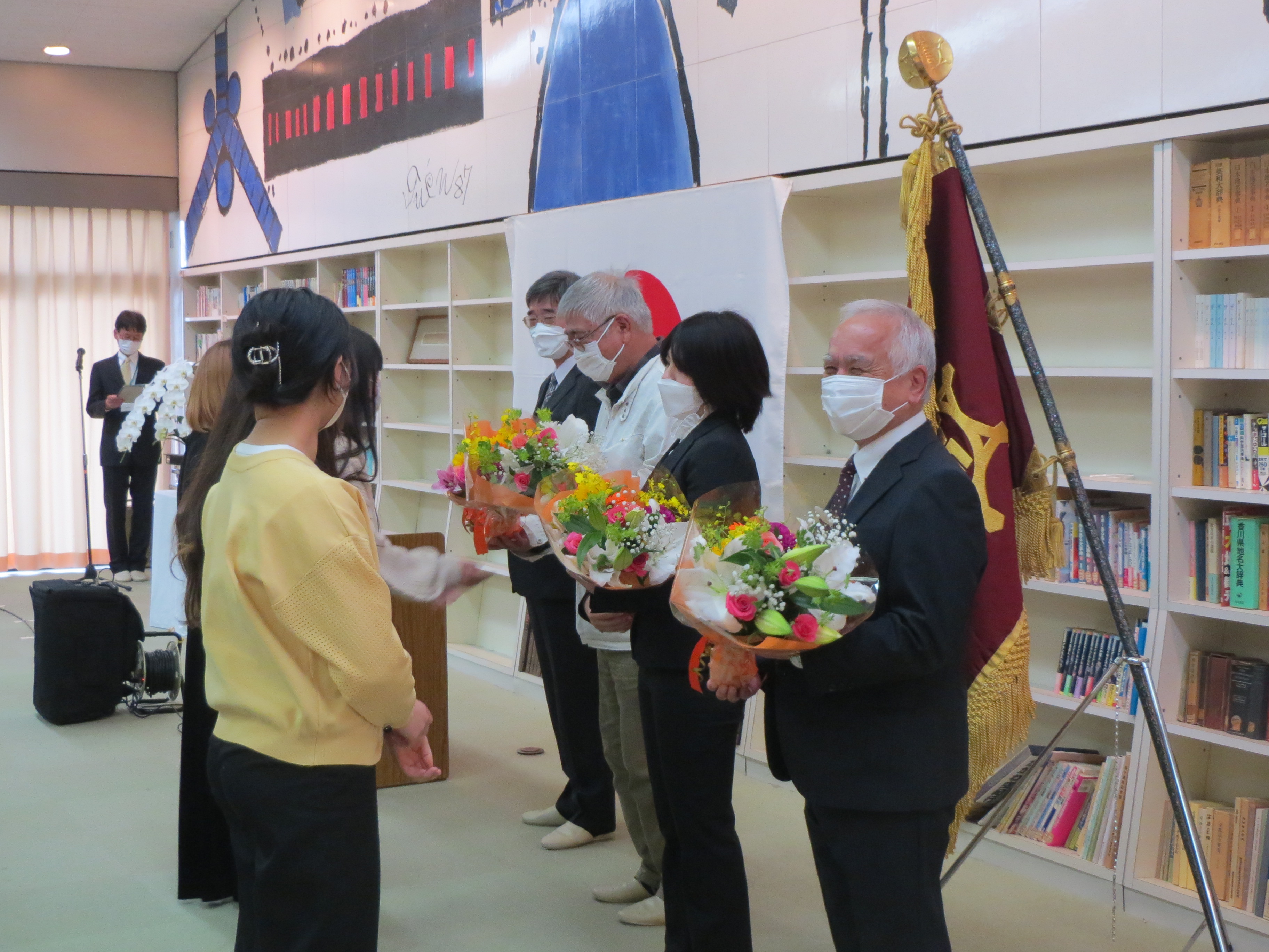 離任式では、昨年度までお世話になった山本校長先生、朝見先生(国語)、池内先生(地歴・公民)、粂野先生(ジョブサポートチィーチャー)の4名の先生方に感謝の気持ちを込め花束を贈呈し、別れを惜しみました。また、当日は所用のため欠席された葛西先生(保健体育)も紹介されました。