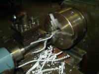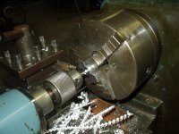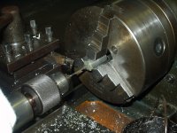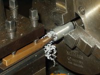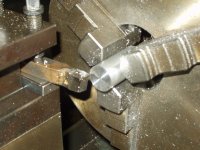 | 7.車軸シャフトを通すための穴をあける。 | 8.ホイルの内側を中ぐりバイトで切削 | ||
