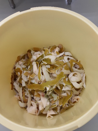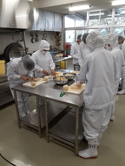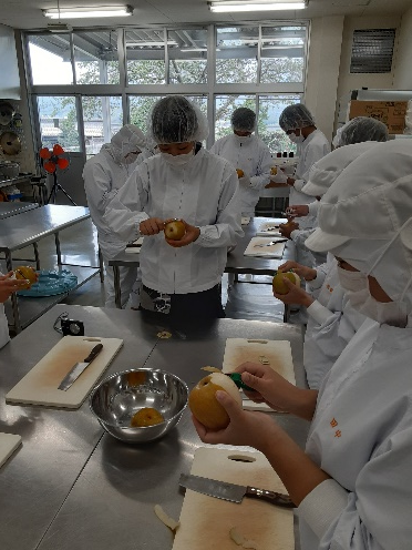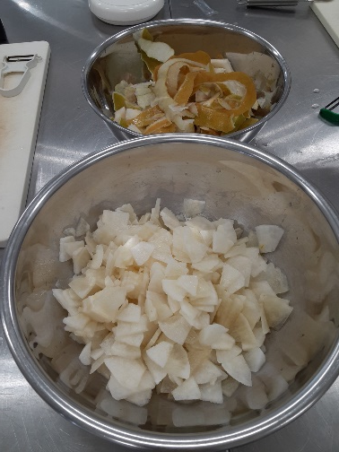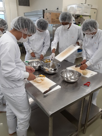 先生「それでは、今日の午前中は梨のジャムの試作を行います。まずは梨の皮をむいて、細かく切ります。一部はフードプロセッサーにかけてペースト状にします。細く切った果肉と、ペースト状の果肉を混ぜる割合や、砂糖の分量を変えながら、まずは試作品を作ってみましょう。」