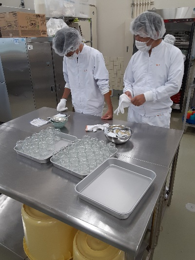 男子と女子がそれぞれ加工台に分かれ、『瓶にジャムを入れる係』『瓶のジャムをすり切りいっぱいに微調整する係』『瓶の周りに付いたジャムを拭き取る係』『瓶にふたをする係』がそれぞれの役目をこなしながらてきぱきと作業が進みます。