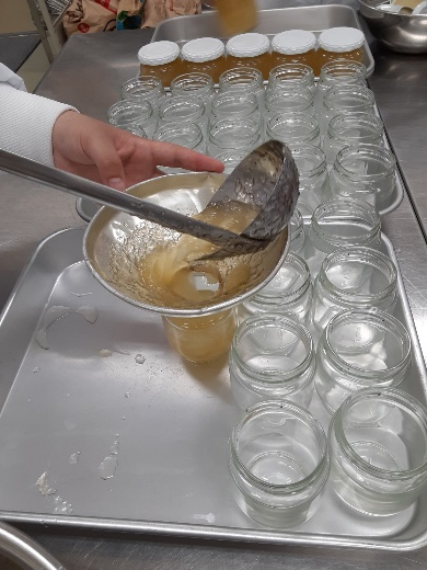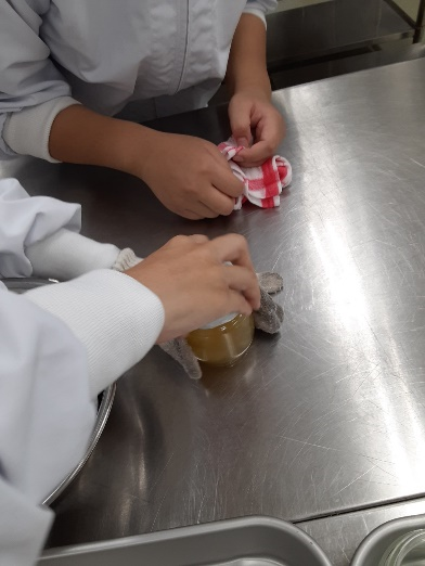 ここでチャイムが鳴りそうになったので、この日の授業は終わりました。煮沸消毒した瓶は先生が鍋から取り出しました。このあと、ゆっくり冷ましてからラベルが貼られるそうです。