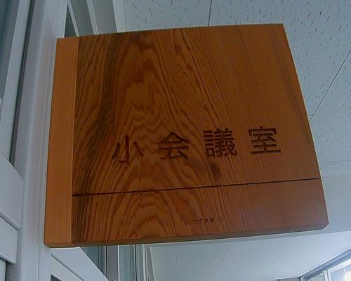 無機質なRC構造の校舎外観とは対照的に、校舎内にはいろんな箇所に木材が使われています。その一つが全国から集めた様々な無垢材を使ったクラス名プレートです。