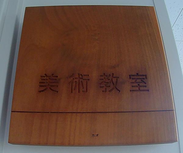 無機質なRC構造の校舎外観とは対照的に、校舎内にはいろんな箇所に木材が使われています。その一つが全国から集めた様々な無垢材を使ったクラス名プレートです。