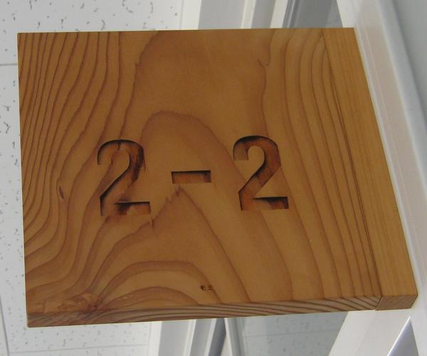 無機質なRC構造の校舎外観とは対照的に、校舎内にはいろんな箇所に木材が使われています。その一つが全国から集めた様々な無垢材を使ったクラス名プレートです。
