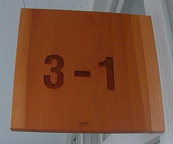 無機質なRC構造の校舎外観とは対照的に、校舎内にはいろんな箇所に木材が使われています。その一つが全国から集めた様々な無垢材を使ったクラス名プレートです。