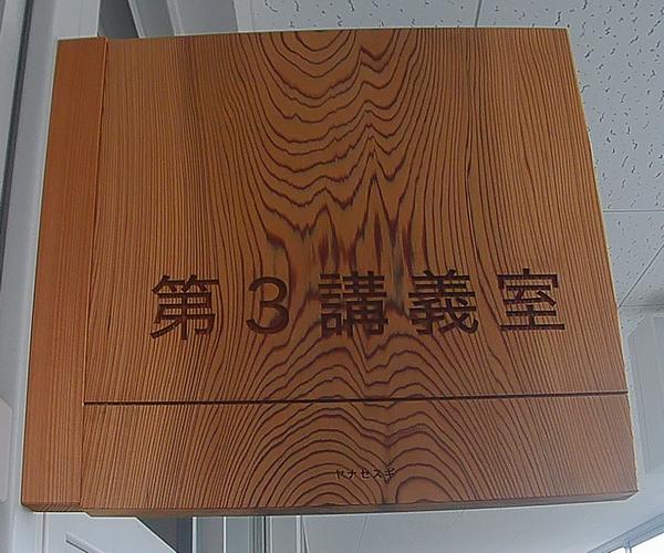 無機質なRC構造の校舎外観とは対照的に、校舎内にはいろんな箇所に木材が使われています。その一つが全国から集めた様々な無垢材を使ったクラス名プレートです。