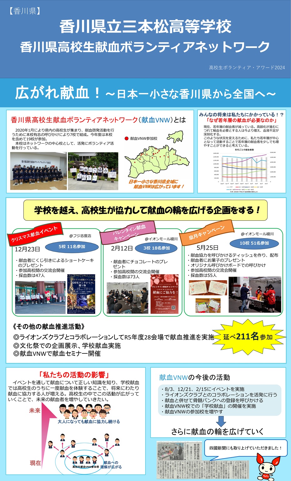 献血バスの運行に合わせて、香川県高校生献血VNWとして献血イベントの企画・運営をしています。献血協力の呼びかけ用のボードを製作したり、ティッシュ配り用のチラシをデザインしたり、献血に協力してくれた方へのプレゼントを選んだりして、イベントの準備を行なっています。イベント当日はボランティアに来てくれた加盟校のメンバーの役割分担を指示したりシフトを決めたりするなど、イベント成功に向けて他校のメンバーとも協力しています。