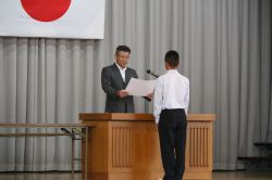 始業式に続き賞状伝達、国体壮行会と行われました。 賞状伝達では、夏休み中の大会などで入賞した、ウエイトリフティング部、レスリング部、バレーボール部、空手道部、土木技術研究部、写真部に賞状が渡されました。