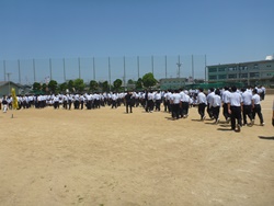 自治体の方々も参加した防災訓練が行われました。地震が発生し、香川県に大津波警報が発令されたことを想定し、運動場に避難した後、津波に備えて校舎に再び避難するという訓練をしました。